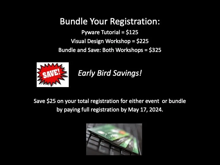 100% on line visual design workshop running from 9:00 am to 12:00 Noon each day (Eastern Time)